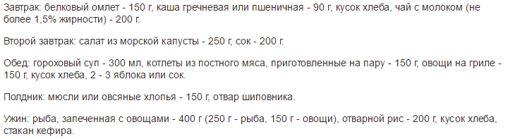 - обед – овощной суп на воде с растительным маслом; отварной картофель; 100 граммов отварного мяса; компот из сухофруктов;