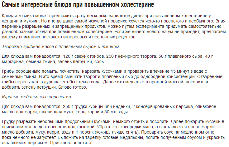 [sc name=”info2″ text=”Лечебная диета при повышенном холестерине предполагает приготовление блюд с ограничением соленых продуктов и жиров животного происхождения. Необходимость понижения уровня холестерина определяет врач.” ]