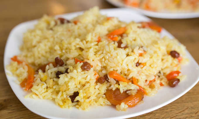 На обед или ужин можно приготовить плов с сушеным виноградом.